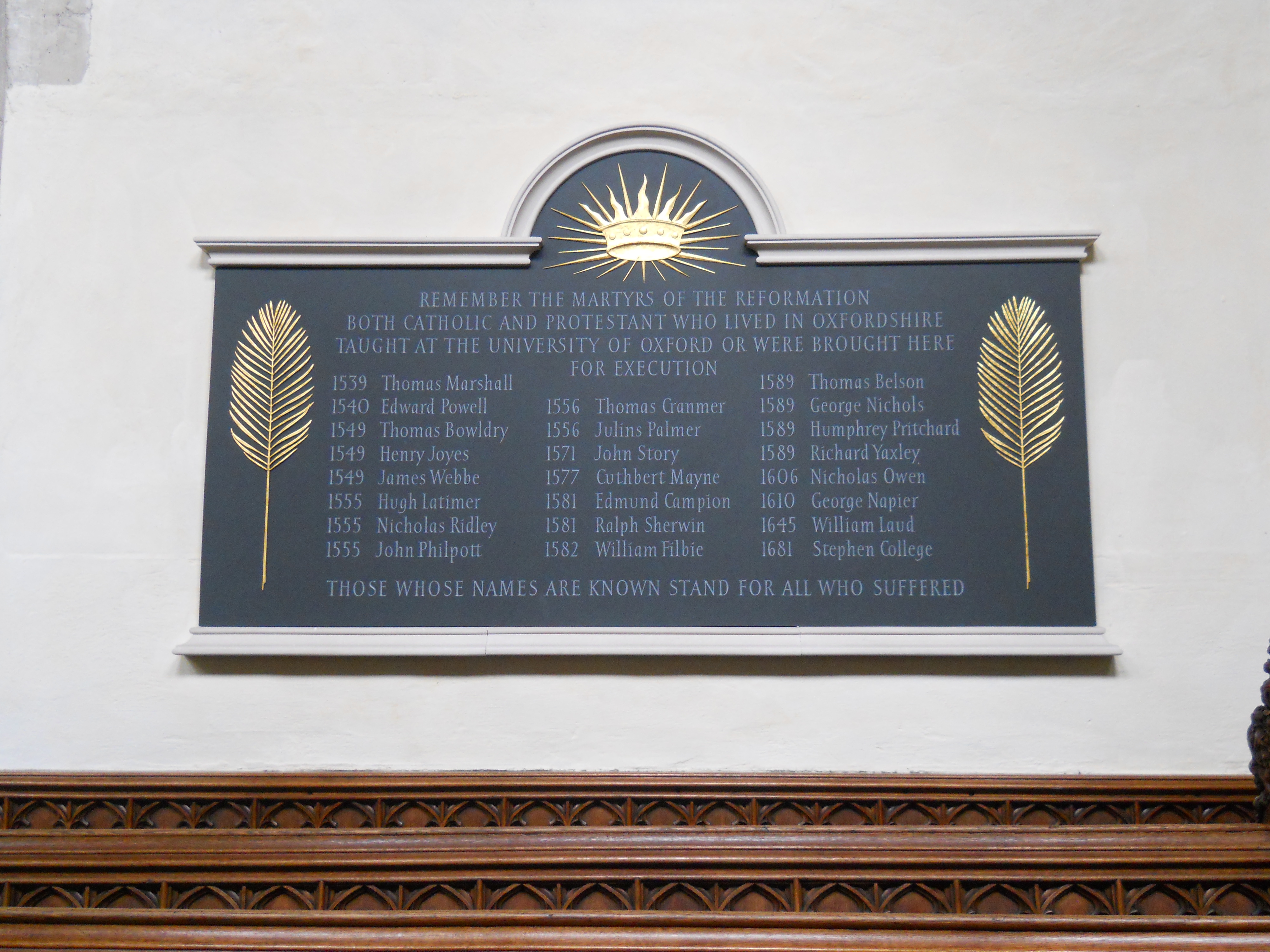 The names represent men (no women) from very diverse backgrounds – Catholics that resisted Henry VIII’s break with Rome, Catholics that rebelled against the Protestant Edwardian regime, Protestant Marian martyrs like Cranmer, many Catholic priests executed during a period of intense persecution in the Elizabethan 1580s, Protestant Archbishop Laud, executed by Parliament during the English revolution of the 1640s, and even Stephen College, a victim of the Popish Plot of Charles II’s reign. (For fuller details on these men, see the end of the post[2]). There is no date on the plaque but its appearance and irenic spirit give the impression that it is quite recent. The list of martyrs is comprehensive and inclusive, a modern monument to the human cost of religious reform as well as the extraordinary dedication that religion inspires.