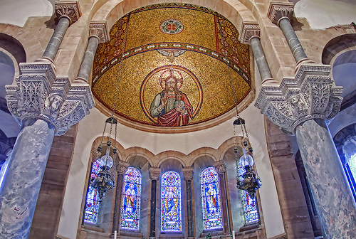 The interior is no less impressive, with decorative sanctuary stalls topped with figures of local saints; lamps that are copies of those located in Saint Mark’s Cathedral, Venice; marble pillars; and a white marble altar with a golden mosaic in dome above. What I didn’t find out until I returned home and looked it up, was that the sanctuary stalls were carved by none other than Harry Hems, who was one of several skilled craftsmen bought in by the vicar to complete the chapelry’s interior. Hems was of course the master sculptor and wood carver responsible for the creation of the Exeter martyr memorial that inspired my original series of posts. Based in Exeter, he would have travelled some distance to work on St Catherine’s, so it was certainly a happy coincidence to stumble across more examples of his work in such salubrious surroundings, a long way from home.