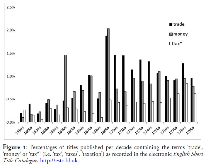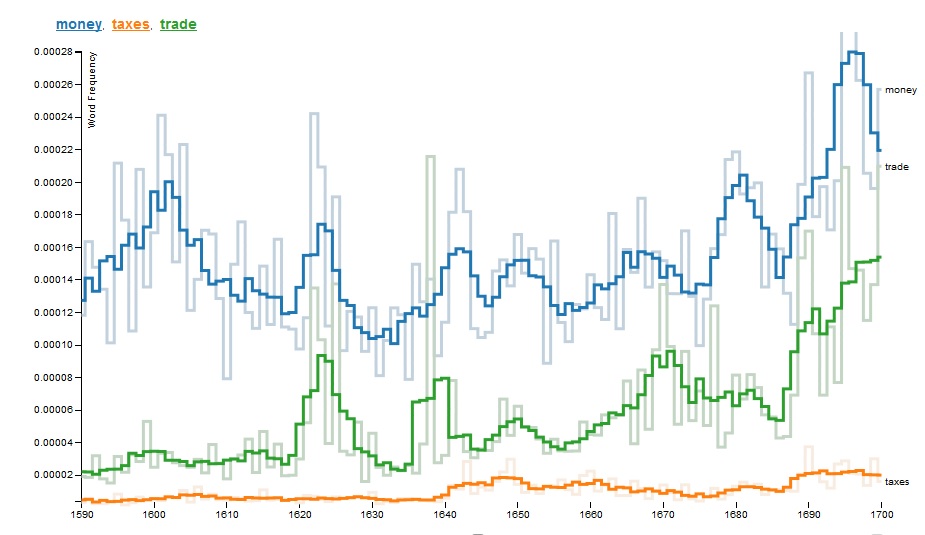 Thanks, Stephen. It’s a great tool. I cited it as supporting evidence in the EHR article, but didn’t actually include the ngram because (1) it wasn’t available when I started researching this, so I started with the ESTC method borrowed from Phil Withington; (2) it ends in 1700, which is rather annoying when you are trying to show that the 1690s were exception rather than just part of a gradual growth in the use of these terms; (3) it is tricky to do wild-cards, so ‘tax/taxes/taxation’ becomes difficult to track. Still, I was very pleased to find that it confirmed my suspicions and reinforced the ESTC evidence!