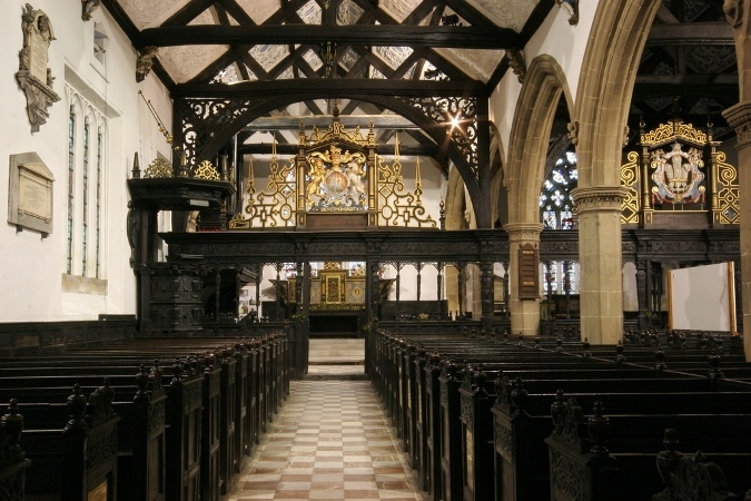 A series of stained glass windows at St John’s depicts its benefactor, John Harrison. This is based on an apocryphal tale in which Harrison presented Charles I, imprisoned in Leeds, with a tankard of gold coins disguised as a draught of ale.
