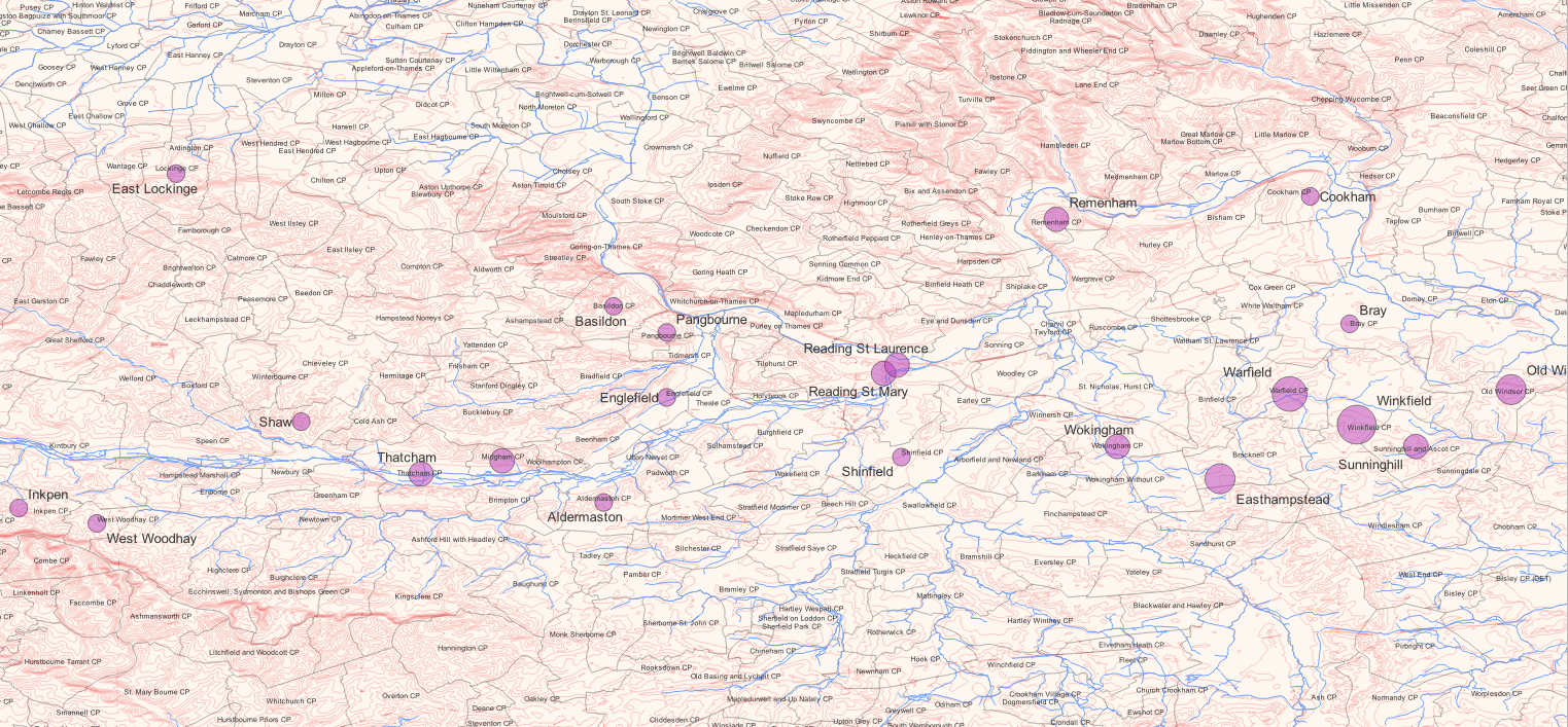 Of course, every Black and minority individual’s experience of life in historic Berkshire would have been unique. Working on a case-by-case basis may be the only way to recover those lived experiences. These efforts are already underway; my upcoming article will tell the story of George Freeman, a liberated African boy brought to Remenham parish after rescue from a Portuguese slaving ship in 1811.[14] Such storytelling efforts will, we hope, also enable community engagement with BRO’s research findings.Fig. 2 (click to enlarge): geographical distribution of signified individuals per parish, with proportionate datapoint sizes, from Berkshire parochial records 1726-1825. Mapped in QGIS using BRO data, over OS and NaturalEarth datapackages.[15] G. Moore 2022.