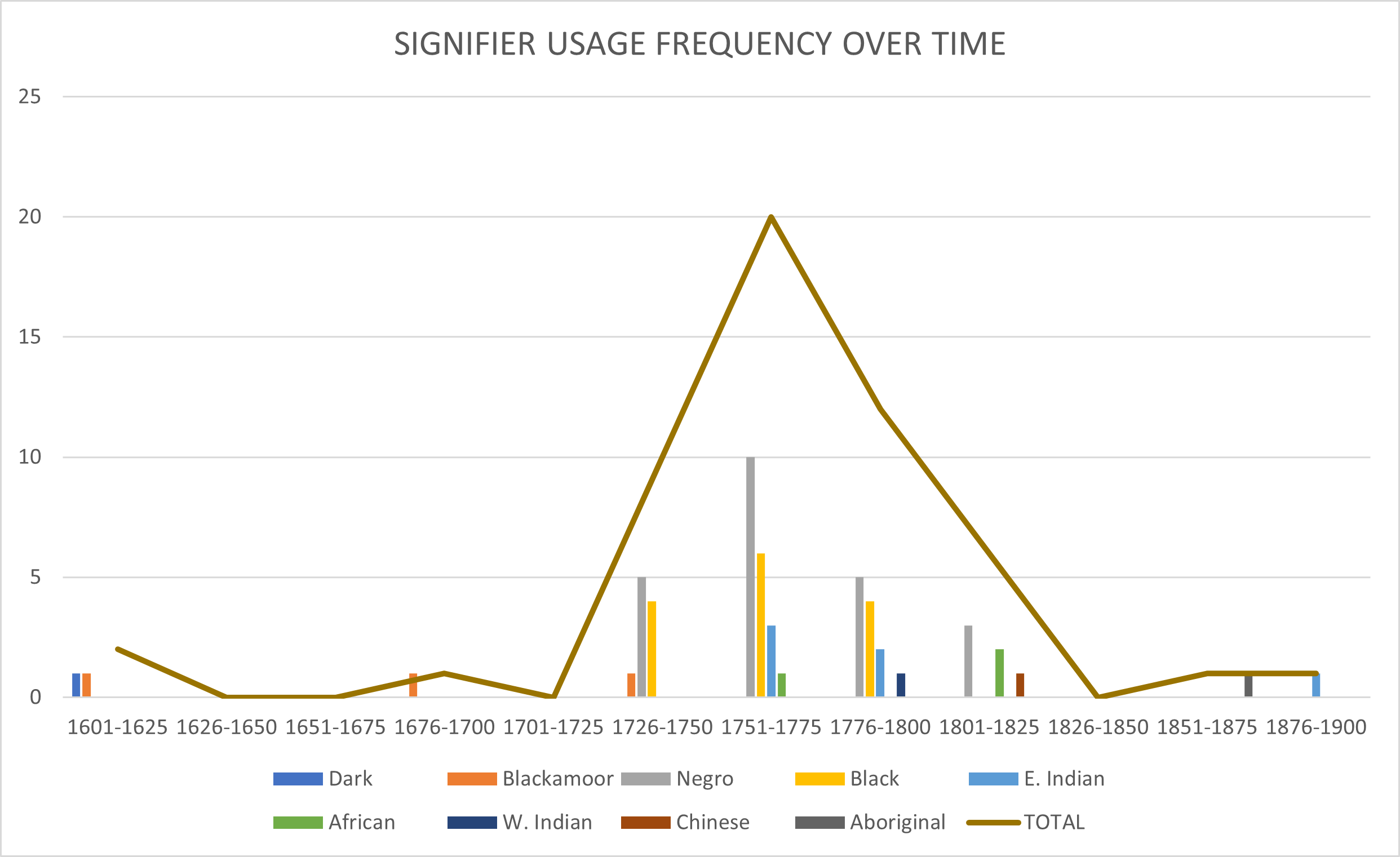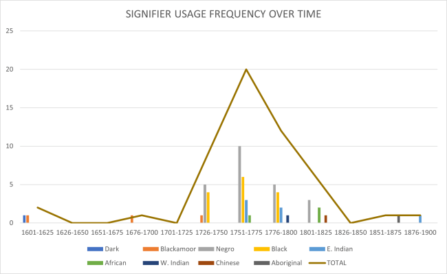 Research undertaken at BRO has found 48 people visible within the records as ‘minorities’. These people, representing various identities – Black, East Asian, aboriginal Australian, and more – appear within the parochial records as early as 1610.[7] Per Habib, we should consider these figures as “symptomatically indicative” rather than fully representative.[8] Parochial records are formulaic, and usually brief; there was no requirement for incumbent record-keepers to note race, ethnicity, or cultural identity.[9] Where these identities do appear to us, they are signified by surplus information – by descriptors (‘blackamoor’, ‘negro’, etc.) or by “recognisable morphologies” of non-English names.[10]Fig. 1 (click to enlarge): graph showing frequency of use for different signifying terminology over time, in Berkshire (BRO) records. G. Moore 2022.