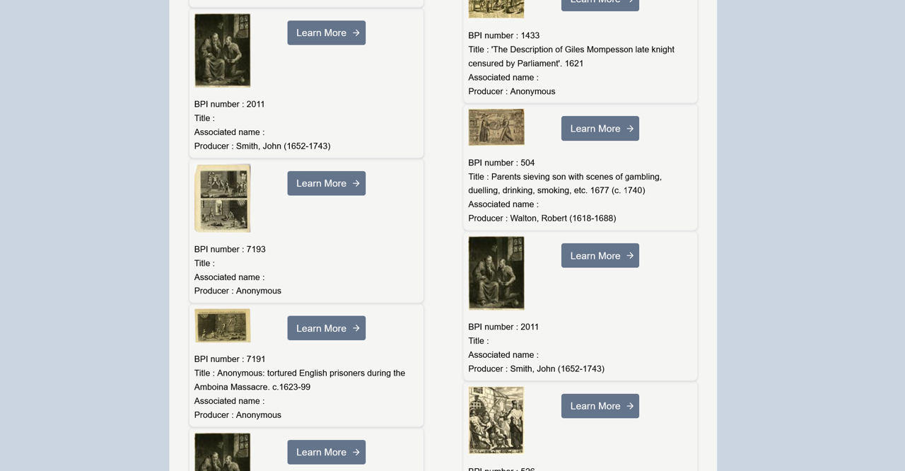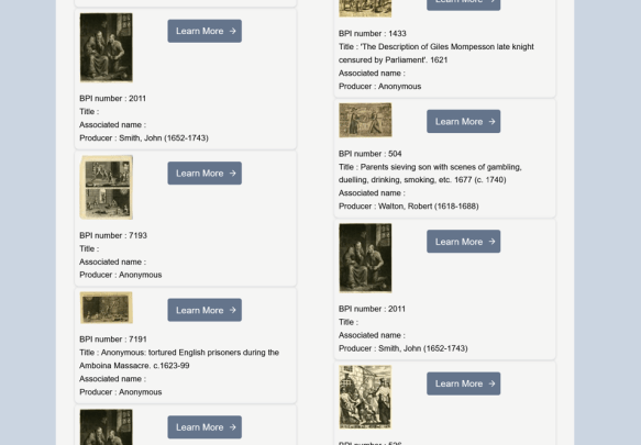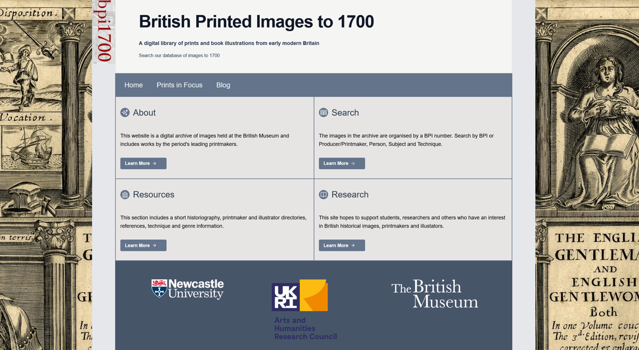 Adam’s project also secured the future of a vital resource for the study of British visual culture, the British Printed Images to 1700 (BPI) database. The original BPI project ran between 2006 to 2009, led by Michael Hunter. The team worked closely with the Department of Prints and Drawings at the British Museum, and the Department of Word and Image at the Victoria & Albert Museum. Software engineering was completed by the Centre for Computing in the Humanities at King’s College London. The website and database were updated, redesigned, and relaunched in last year as part of Adam’s new AHRC project. Software and database design was undertaken by Research Software Engineering, Newcastle University.The BPI database contains almost 11,000 prints and book illustrations. It includes political satires, portraits, maps, landscapes, architectural drawings, playing cards, and titlepages of books, and includes works by the period’s leading printmakers. There are depictions of events, representations of ideas and beliefs and the natural world. There are images of places and activities, and many record the incidental details of early modern life, the clothes, objects, and wares that defined people’s place in their society. The prints have been catalogued using terms derived and adapted from Iconclass and the Library of Congress Subject Headings. They can be searched according to Printmaker, Subject, Person, or Technique.