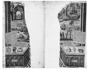 There is no helpfully datable detail on the remaining fragments of this impressively large print (‘royal’ – roughly 520 x 440mm), but we may be sure that it predates Stent’s activity as a print-publisher which began in 1642. That’s because its tombs and the church and funeral procession were cut out of another impression and pasted into one of the concordances compiled by the Little Gidding community for the gospel harmony they presented to Charles I in May 1636.[4] In fact, though not quite the “whited sepulchres” required by the Biblical verse, the two cut-out tomb sides have been butted together and stuck down by their upper edges only, so that they may be lifted up to reveal the skeletons and reptiles inside – and the words of Matthew 23, xxviii: But within full of Deade Mens Bones and of all uncleaneess [sic]. This kind of lift-the-flap paper technology – though here home-made – imitates that of many contemporary continental prints [Figure. 3].[5]