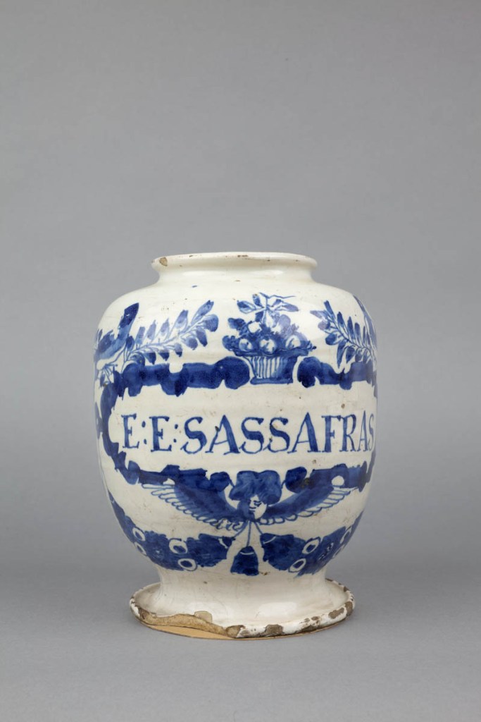 An English drug jar, circa 1730 Published March 25, 2021 at 800 × 1200 in An English drug jar, circa 1730 SBT 1993-31/56. An English drug jar, circa 1730; painted in blue on a white background; E.E.SASSAFRAS (Electuary of Sassifras) on a songbird and basket label. Dimensions: Height 195mm. Diameters: base 125mm, rim 90mm.