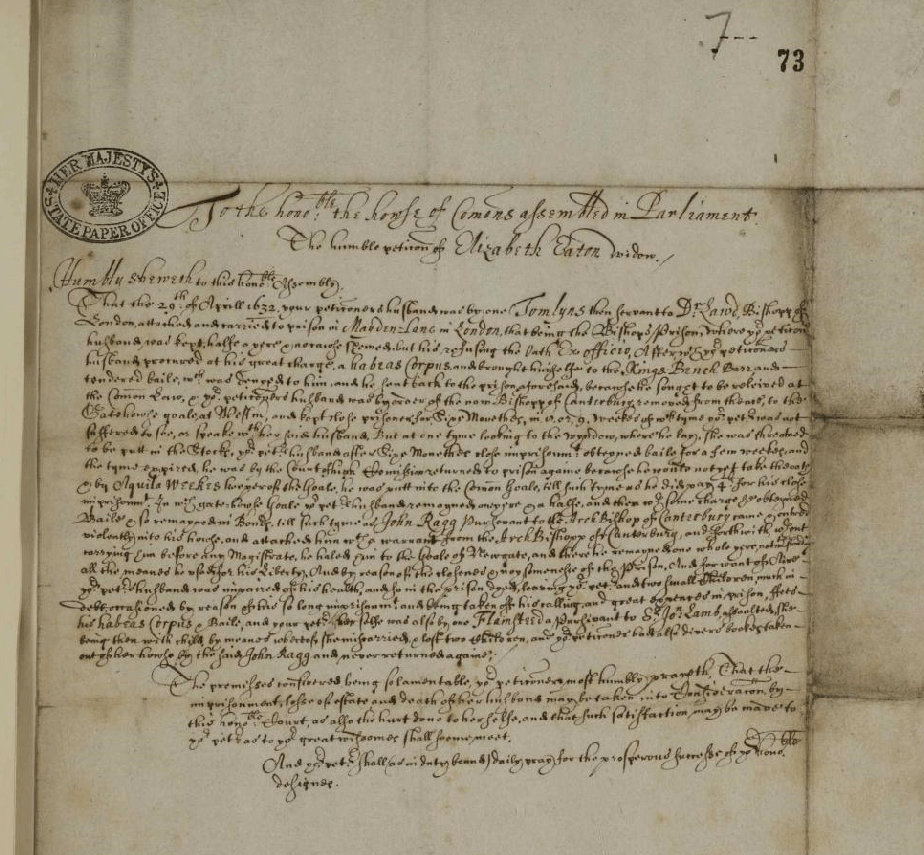 The homes of religious dissenters were constantly under siege. Men, women and children were routinely roused in the middle of the night, chivvied and dragged – at times quite literally – to be interrogated or thrown in prison. The result of such upheavals, if a woman was with child, could be miscarriage or a stillbirth. Elizabeth Eaton (fl. 1632–1641) was an active member of the Baptist Lathrop congregation in London who, along with several other women, was questioned by the High Commission court in the early 1630s. In 1641 she wrote a petition to the House of Commons (see Figure 1). Elizabeth explained that she was now a widow having lost her husband, Samuel Eaton (d. 1639) (who was also a Baptist), by his ‘wrongful imprisonment’. On one of several occasions that Samuel was arrested, Elizabeth describes how one John Ragg, Archbishop William Laud’s pursuivant, ‘violently entered his [Samuel’s] house and … haled him to Newgate’. Elizabeth, ‘being then with child’, was ‘assaulted by Flamsteed, a pursuivant to Sir John Lamb’, which ‘caused her to miscarry’. She was not alone in reporting such violence. Other women of the Lathrop congregation said that their own miscarriages were a result of the rough treatment they had received when arrested. Elizabeth’s petition clearly made an impression on the Commons. It was later included amongst papers relating to the trial of Archbishop Laud, as evidence of his excessive cruelty in prosecuting religious sectaries.