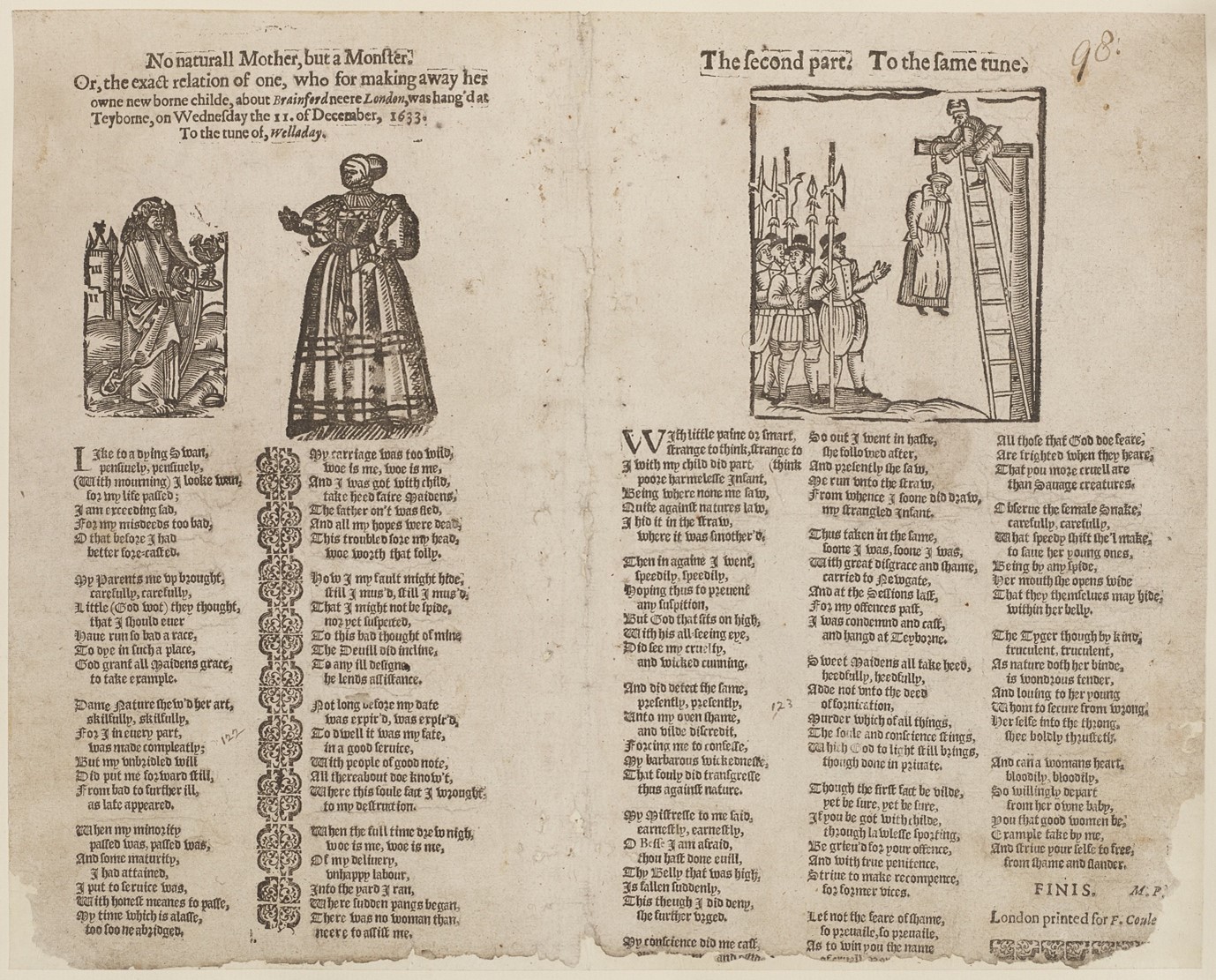 It’s December 11, 1633. After hearing St. Sepulchre’s Church toll its ominous passing bell, you’ve made your way to Tyburn to witness the latest spectacle of public execution. This time, a woman found guilty of infanticide faces the scaffold. Hundreds of spectators have gathered in the surrounding streets and fields, with onlookers peering out of nearby windows or clambering onto rooftops. You jostle amongst the crowd in an attempt to catch a glimpse of the spectacle, but to no avail. As the victim makes her final speech you strain to hear her words, but her voice is drowned out by the noise of the crowd. Once the grisly spectacle has come to a close you make your way home, but the doleful sounds of a nearby ballad monger selling copies of a song about today’s execution catches your attention. Having seen or heard very little of her demise, you want to know more, so you hand over a penny to the ballad monger. You fold up your copy of the large, single-sheet song, slip it into your pocket and return home, ready to sing, read, and listen to it with friends and family later that day.
