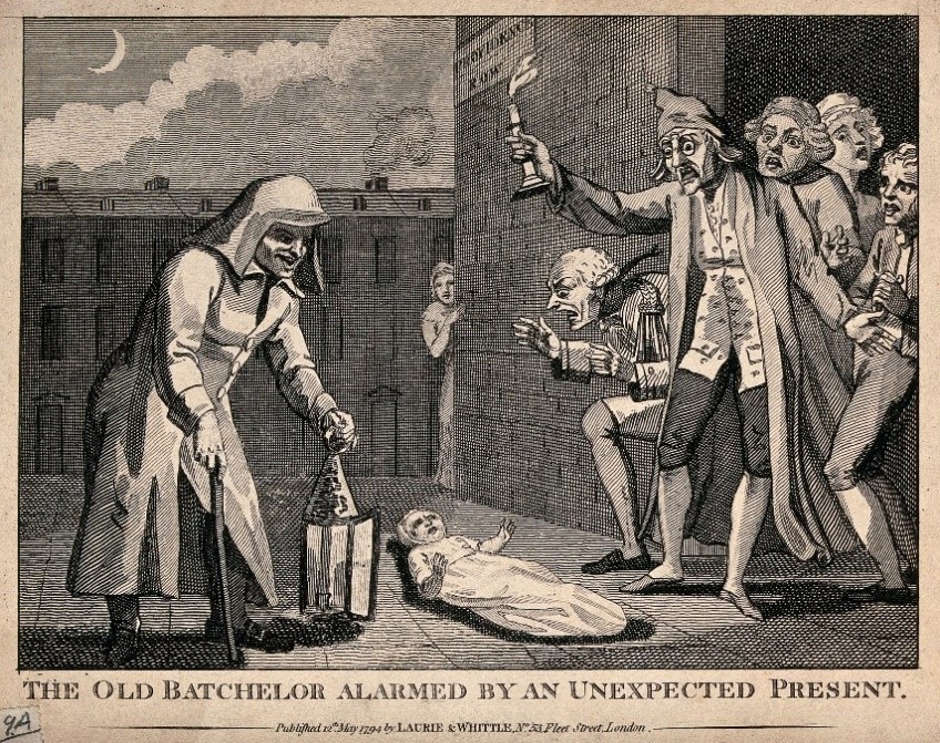 pic 2 Published May 11, 2021 at 854 × 676 in pic 2 A baby has been left outside the town-house of an old bachelor, and a young woman watches from the corner of the street. Engraving, 1794. Wellcome Collection. Attribution 4.0 International (CC BY 4.0).